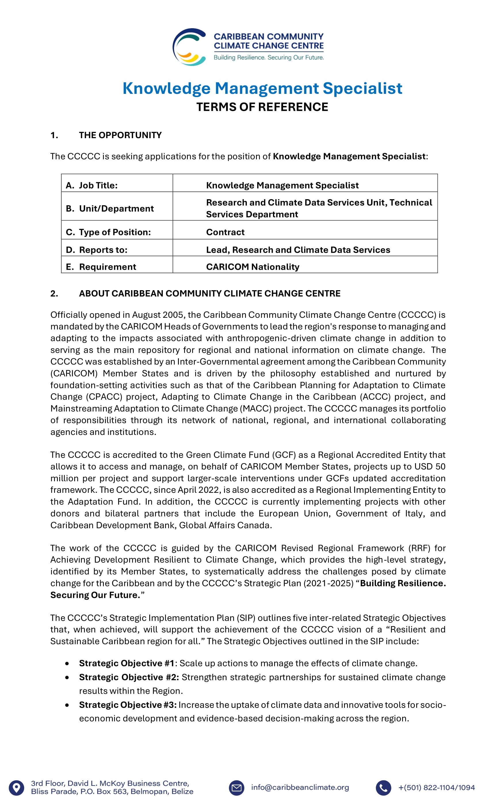 A vacancy exists for a Knowledge Management Specialist to be stationed at our Headquarters in Belmopan, Belize.