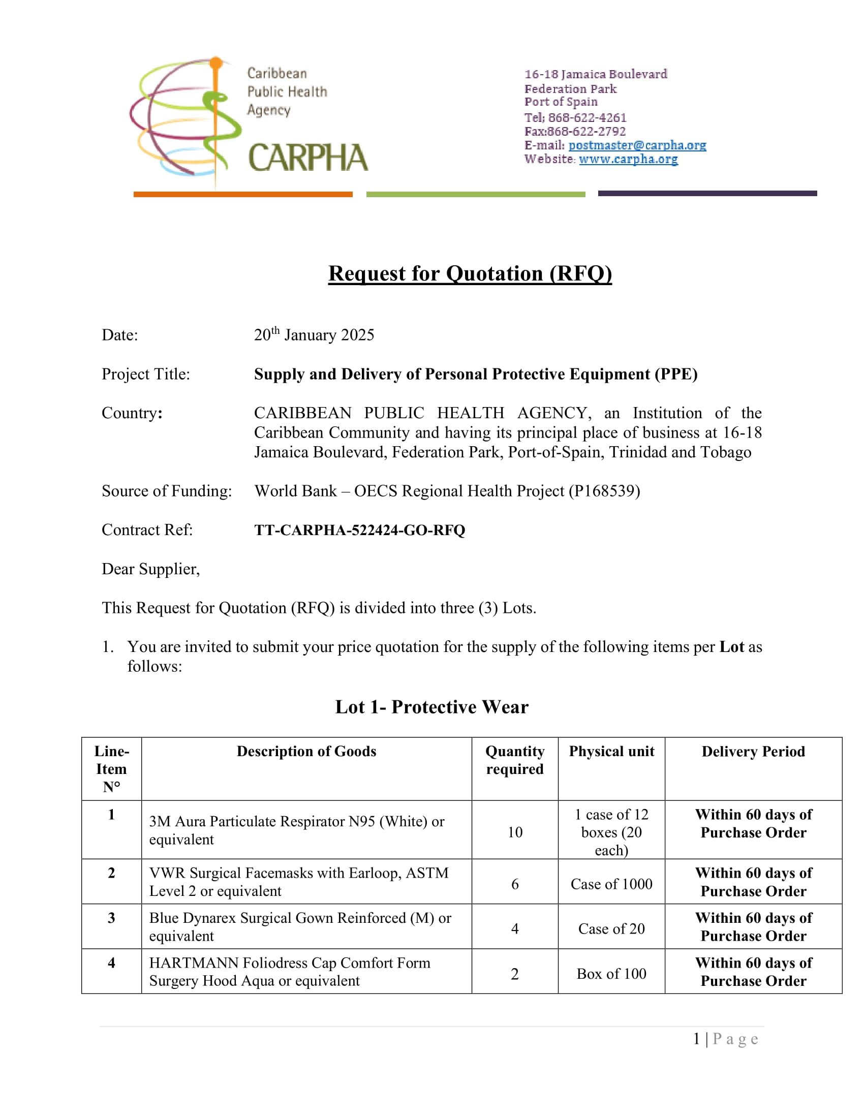 The Caribbean Public Health Agency (CARPHA) has received financing from the World Bank toward the cost of the OECS Regional Health Project (P168539). CARPHA intends to apply part of the proceeds of this financing toward payments under the contract Supply and Delivery of Personal Protective Equipment (PPE)