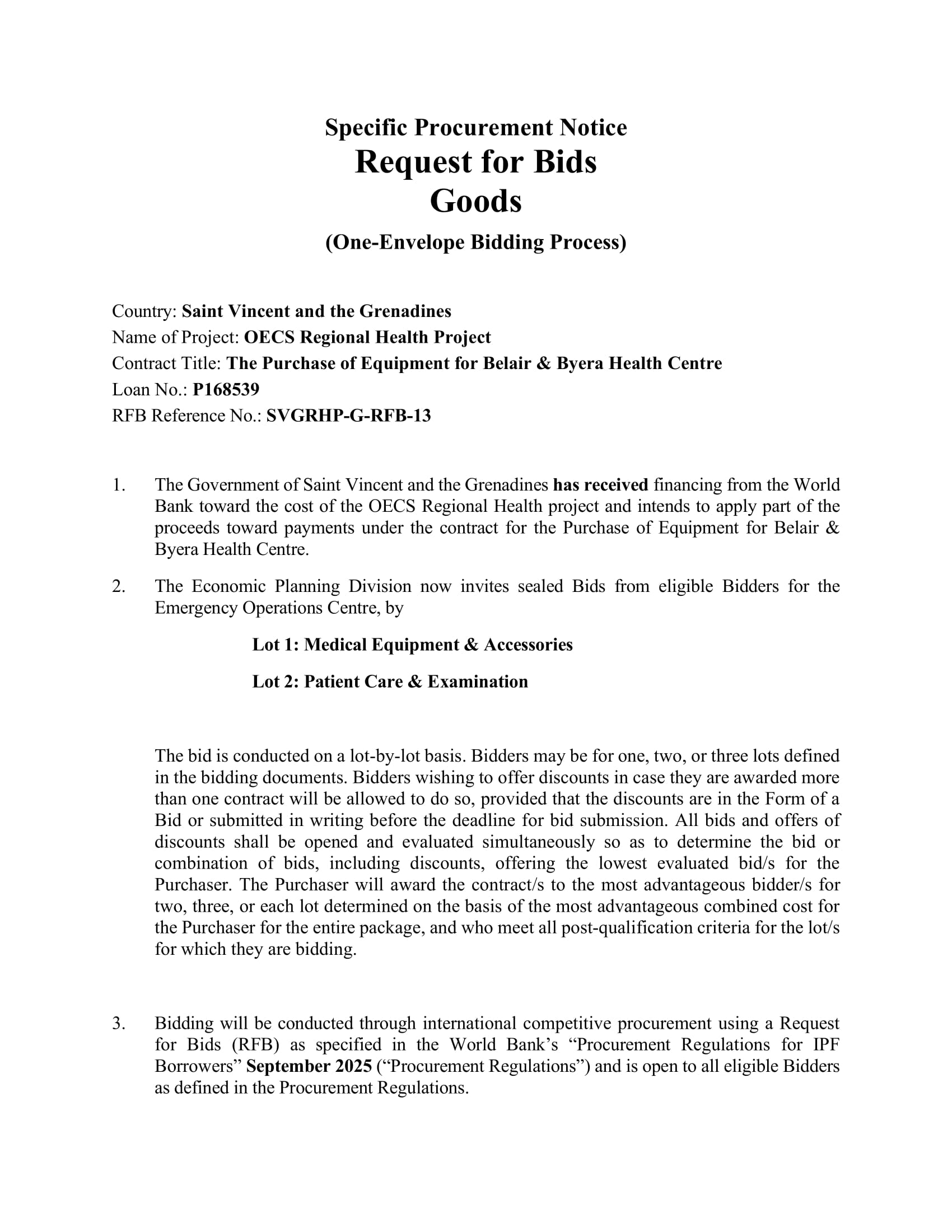 Bids must be delivered to the address below on or before January 29, 2026, at 1300 hours (Local SVG time). Electronic Bidding will be permitted. Late Bids will be rejected. Bids will be publicly opened in the presence of the Bidders’ designated representatives and anyone who chooses to attend at the address below on January 29, 2026, at 1400 hours (Local SVG time).