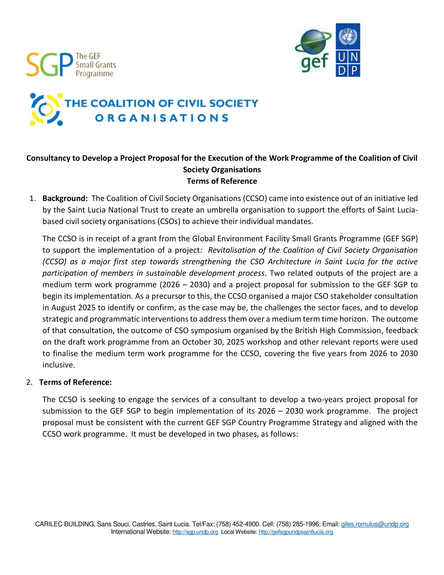 The Coalition of Civil Society Organizations (CCSO) is seeking to engage the services of a consultant to develop a two-year project proposal for submission to the Global Environment Fund Small Grants Programme (GEF-SGP) to begin implementation of its 2026–2030 work programme.