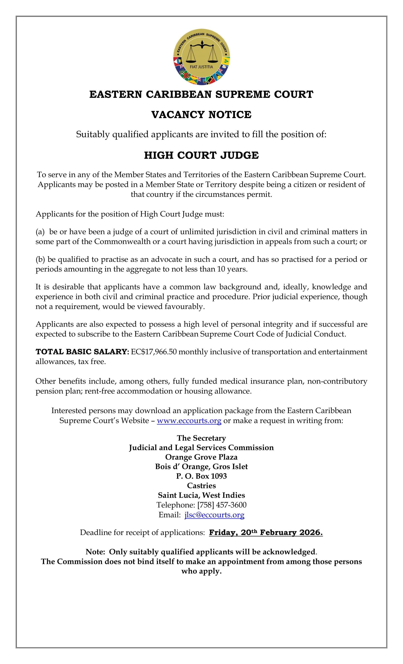 Interested persons may download an application package from the Eastern Caribbean Supreme Court’s Website - www.eccourts.org or make a request in writing from: