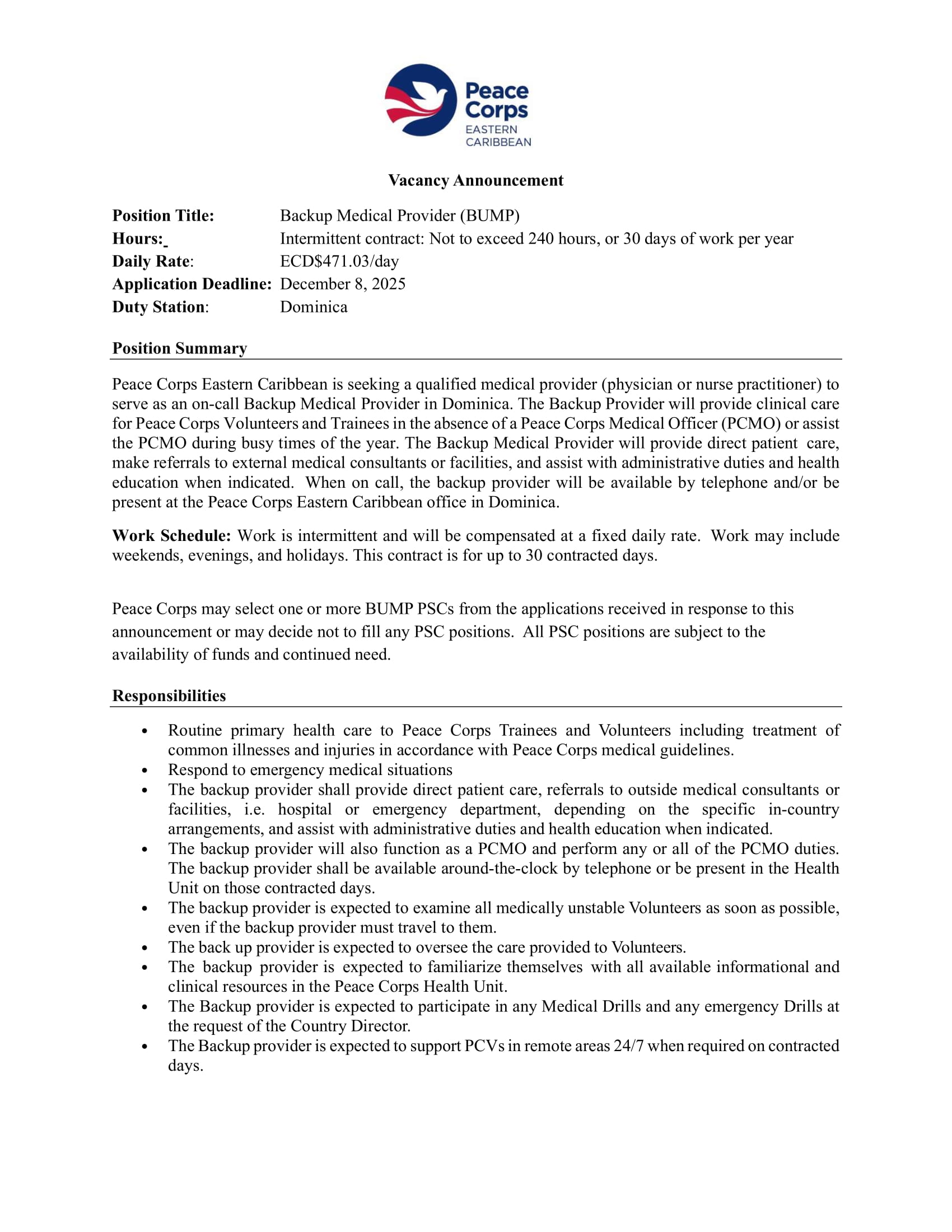 CORPS BACK-UP MEDICAL PROVIDER_DOMINICA Applications must be received via email.