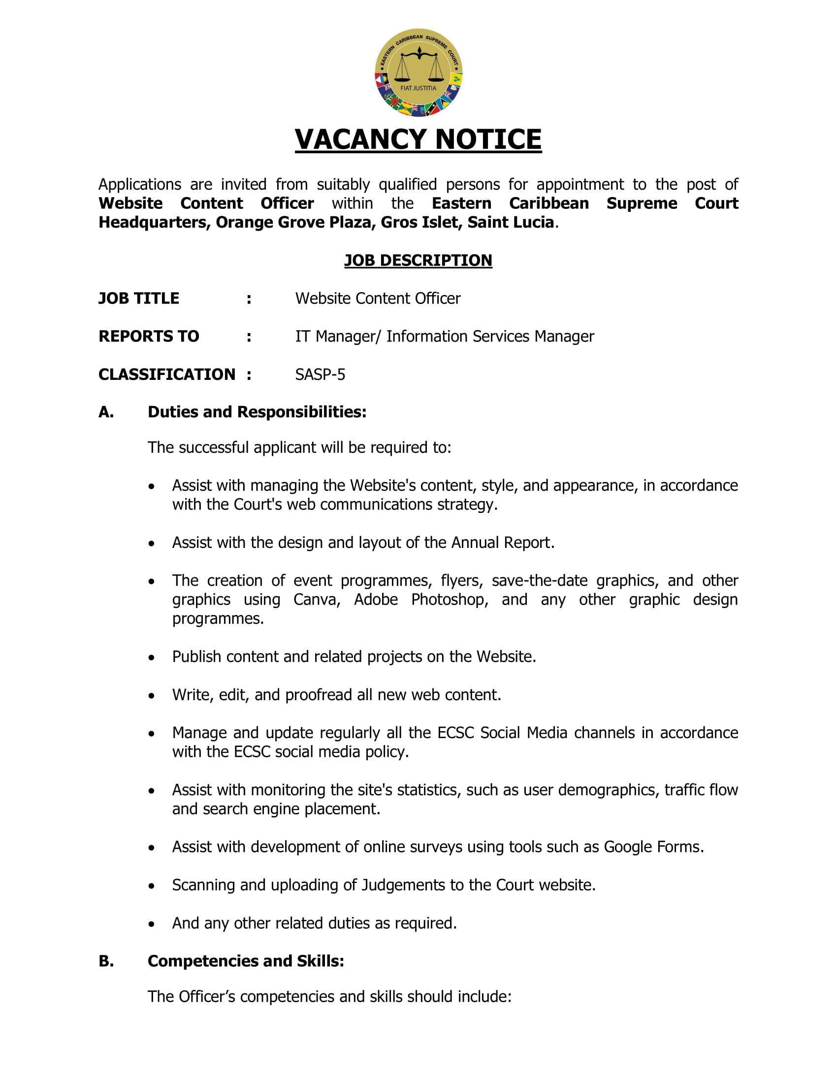 NB: Application forms may be downloaded at the Court’s Website (www.eccourts.org). Applications may also be submitted via email to and/or . Incomplete applications will not be considered. Unsuitable candidates will not be acknowledged. Candidates meeting the minimum qualifications and experience may not be considered for an interview. Only the candidates with the best qualifications and experience will be shortlisted for interview.